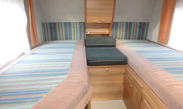 Onder de bedden bevindt zich een ruime bergruimte, perfect om gemakkelijk al je campingmeubilair, zoals tafels en stoelen, op te bergen. Zo neem je alles mee wat je nodig hebt voor een ontspannen vakantie.